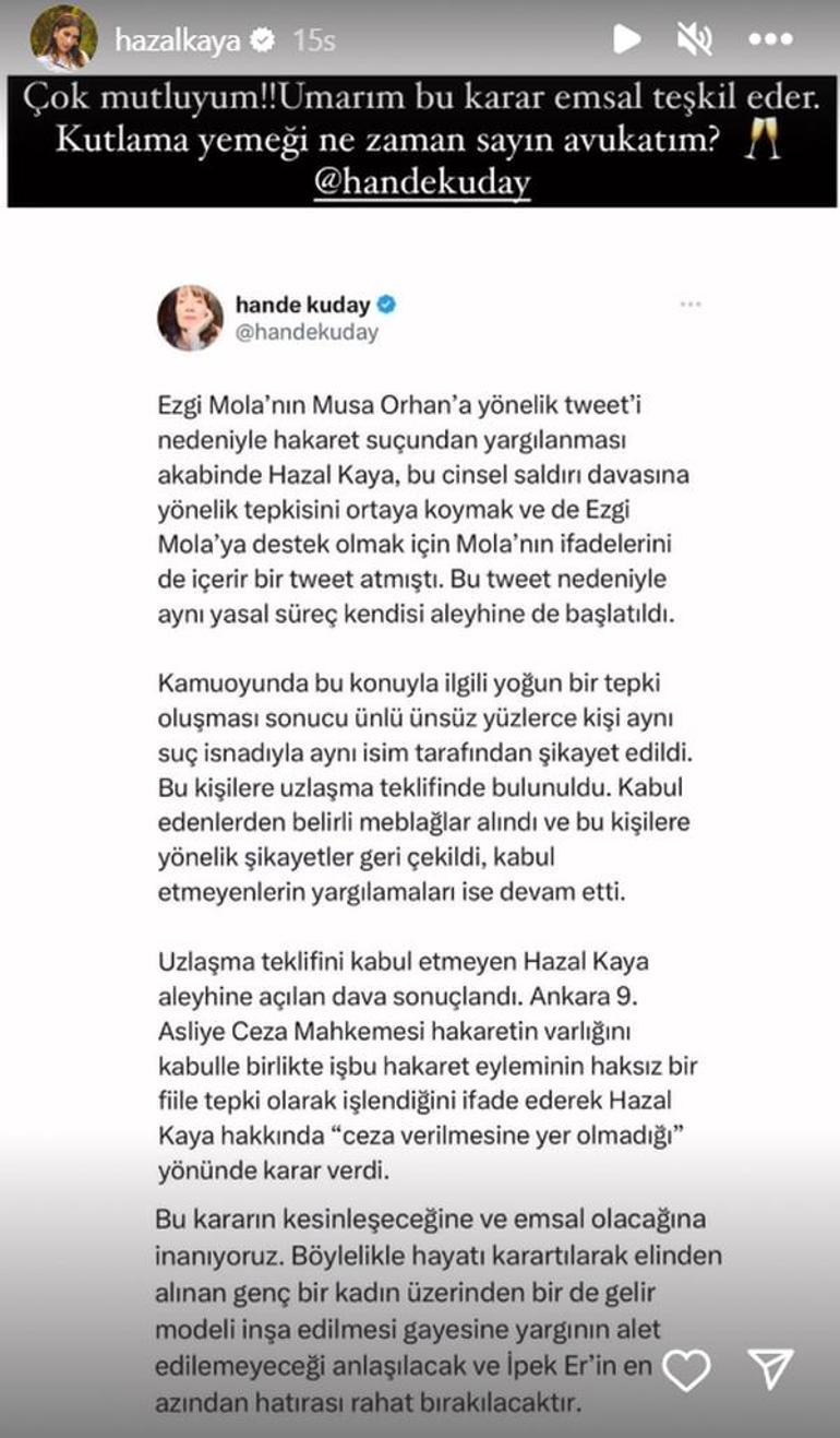Hazal Kaya ise avukatının bu sözlerini kendi "Çok mutluyum. Umarım bu karar emsal teşkil eder" notunu düştü.