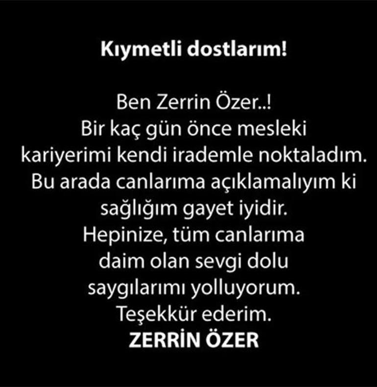 Özer, paylaşımında; "Kıymetli dostlarım! Ben Zerrin Özer..! Birkaç gün önce mesleki kariyerimi kendi irademle noktaladım. Bu arada canlarıma açıklamalıyım ki sağlığım gayet iyidir. Hepinize, tüm canlarıma saygılarımı yolluyorum. Teşekkür ederim. Zerrin Özer" ifadelerini kullanmıştı.
