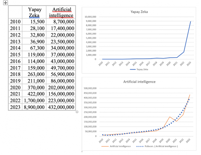 “Artificial intelligence”in her sene artan bir oranda düzenli bir yükseliş grafiği vardır. “Yapay zekâ” ise 2022 yılından itibaren ani bir sıçrama yapar.