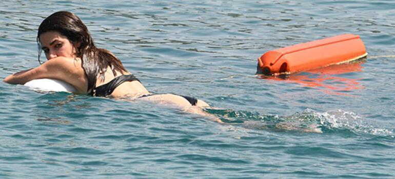 Bir saatlik deniz keyfi sonrası iskeleye dönen oyuncu, bir süre dinlendikten sonra bikinisinin üzerini çıkartıp, güneşlenmeye başlamıştı.