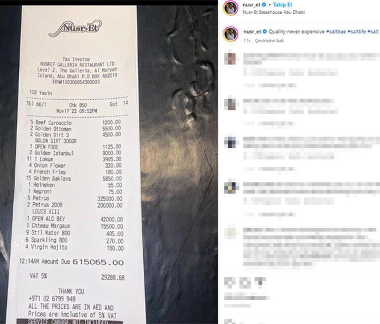 Nusret, son olarak Instagram'da Birleşik Arap Emirlikleri'nin başkenti Abu Dabi'de açtığı restoranından bir hesap paylaşmış ve "Kalite asla pahalı değildir" mesajını yazmıştı. Söz konusu adisyonda, 615 bin dirhem, TL cinsinden yaklaşık 3.1 milyon TL ve "Servis ücreti dahil değildir" notu yazıyordu.