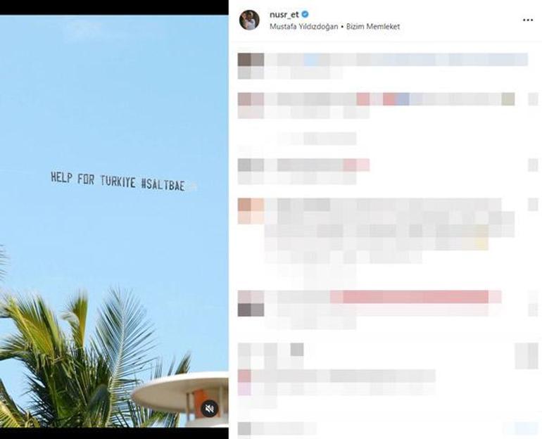 Ünlü isim son olarak, bir uçağın kanadına astırdığı yazının videosunu Instagram hesabından paylaştı. Yazıda İngilizce olarak "Help For Turkiye #Saltbae" (Türkiye için yardım) yazılı olduğu görüldü.