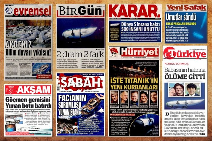 TV’lerdeki haberleri inceleme olanağı bulamadığım için gazetelere baktım; 16 Haziran’dan bu yana batan göçmen teknesi ve milyarderlerin denizaltısı ile ilgili olarak birinci sayfaya çıkarılan haberleri saydım. Aydınlık, Yeni Akit, Cumhuriyet ve Sözcü, bu süre içerisinde bu iki olay hakkında ilk sayfadan hiç haber yayımlamamıştı.