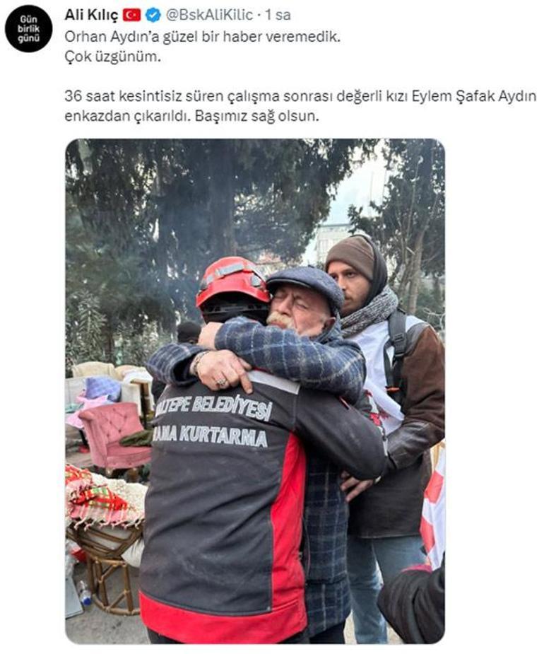 Maltepe Belediye Başkanı Ali Kılıç, "Orhan Aydın’a güzel bir haber veremedik. Çok üzgünüm. 36 saat kesintisiz süren çalışma sonrası değerli kızı Eylem Şafak Aydın enkazdan çıkarıldı. Başımız sağ olsun" mesajını paylaştı.