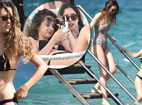 Güzel oyuncu ve kuzeni, havanın rüzgarlı olması sebebiyle suda çok fazla durmadan şezlonga geri döndü.