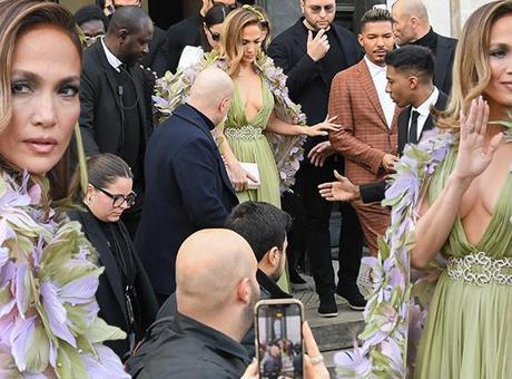 Derin dekolteli, çiçekler içerisindeki elbisesiyle göz kamaştıran 54 yaşındaki iki çocuk annesi Lopez'in etrafını fotoğrafçılar sardı.