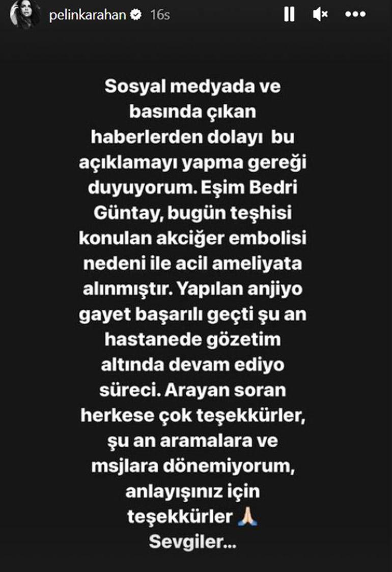 Tüm bunların ardından eşi Bedri Güntay'ın sağlık sorunları yaşadığı haberlerinin basına yansıması nedeniyle açıklama yapan Pelin Karahan, 4.8 milyon takipçisi bulunan Insragram sayfasından şu satırları paylaştı: