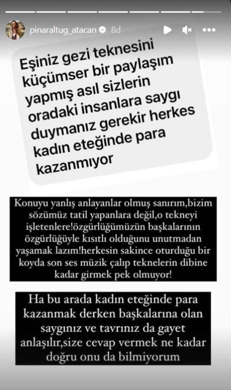 Bir süredir tekneyle tatilde olan çiftten Yağmur Atacan son ses müzikle denizde dolaşan bir tekneyi paylaşarak bu durumu eleştirdi. Ancak Atacan'ın paylaşımı sonrası eşi Pınar Altuğ'a ilginç bir mesaj geldi. Paylaşımı yanlış anlayan kişi Yağmur Atacan'a dair çirkin bir benzetme yapınca ünlü oyuncu Pınar Altuğ sinirlendi.