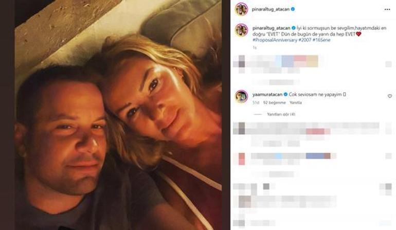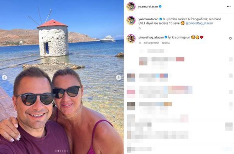 Eşiyle çekilen karelerini peş peşe yayınlayan 40 yaşındaki Atacan, gönderisine; "Bu yazdan sadece 6 fotoğrafımız; sen bana 'evet' diyeli ise sadece 16 sene..." mesajını yazdı. Altuğ ise eşine "İyi ki sormuşsun" diyerek yanıt verdi.