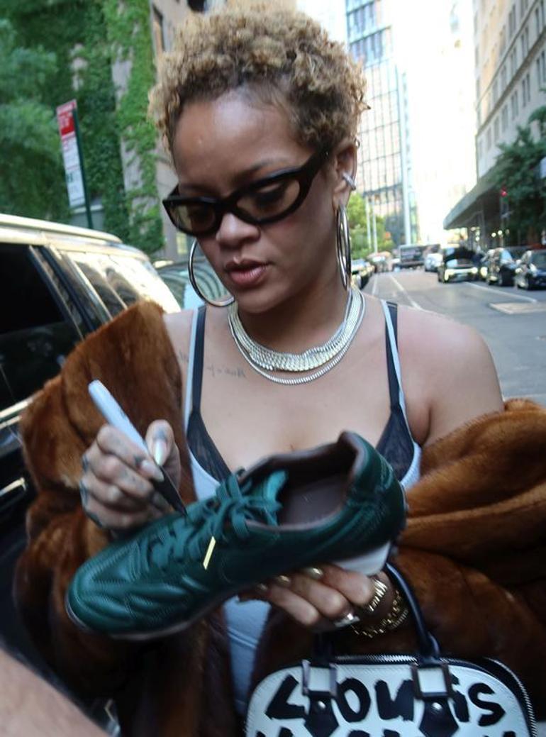 Büyük halka küpeleri ve kolyesiyle de dikkat çeken şarkıcı, hayranlarının yoğun ilgisiyle karşılaştı. Rihanna, bir ara hayranlarından birinin uzattığı spor ayakkabıyı imzalarken görüldü.