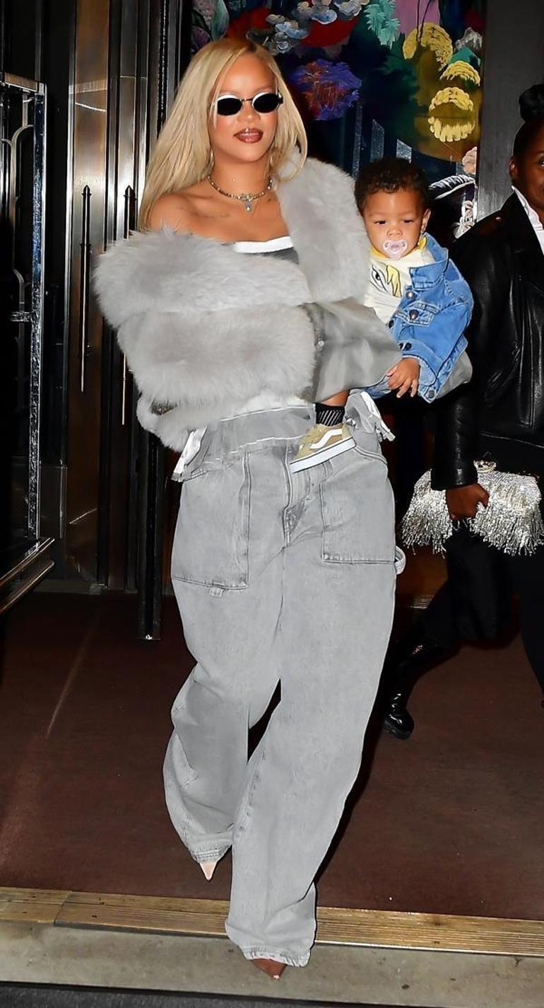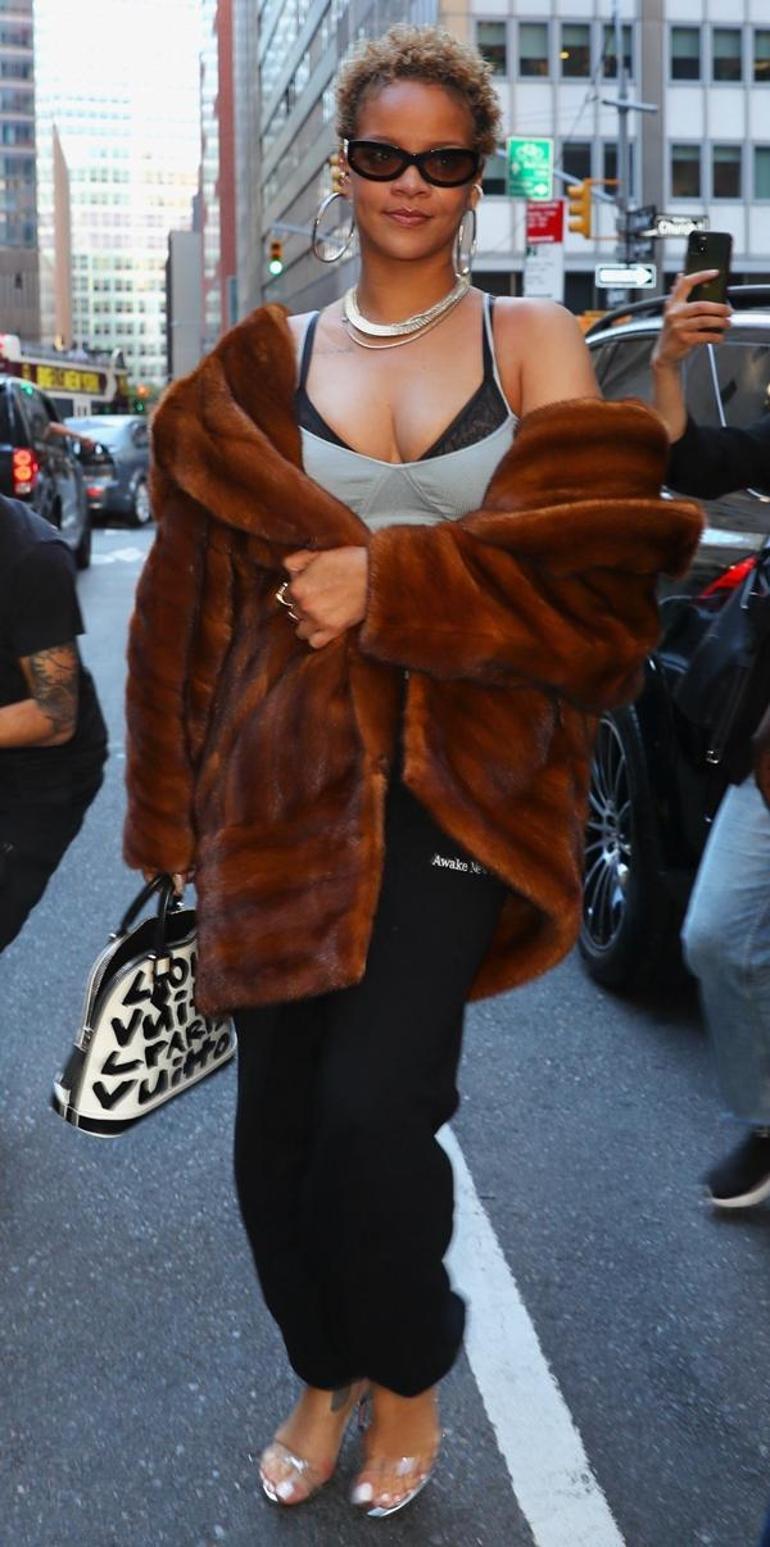 Kıvırcık, kısa, sarıya boyalı saçlarını gösteren Rihanna; siyah, bol bir pantolon, dekolteli gri bir bluz, burnu açık topuklu ayakkabılar ve kahverengi bir kürkle görünümünü tamamladı.