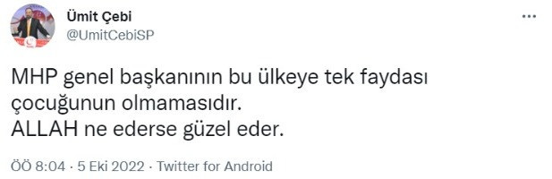 Çebi, paylaşımında "MHP genel başkanının bu ülkeye tek faydası çocuğunun olmamasıdır. Allah ne ederse güzel eder." ifadelerini kullandı.