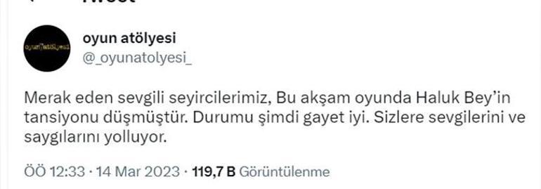 Haluk Bilginer'in kurucusu olduğu Oyun Atölyesi'nin Twitter hesabından da, "Merak eden sevgili seyircilerimiz, Haluk Bey’in tansiyonu düşmüştür. Durumu şimdi gayet iyi. Sizlere sevgilerini ve saygılarını yolluyor" açıklaması yapıldı.