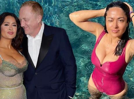 Salma Hayek'ten mayolu pozlar! Eşinin sırtına çıktı