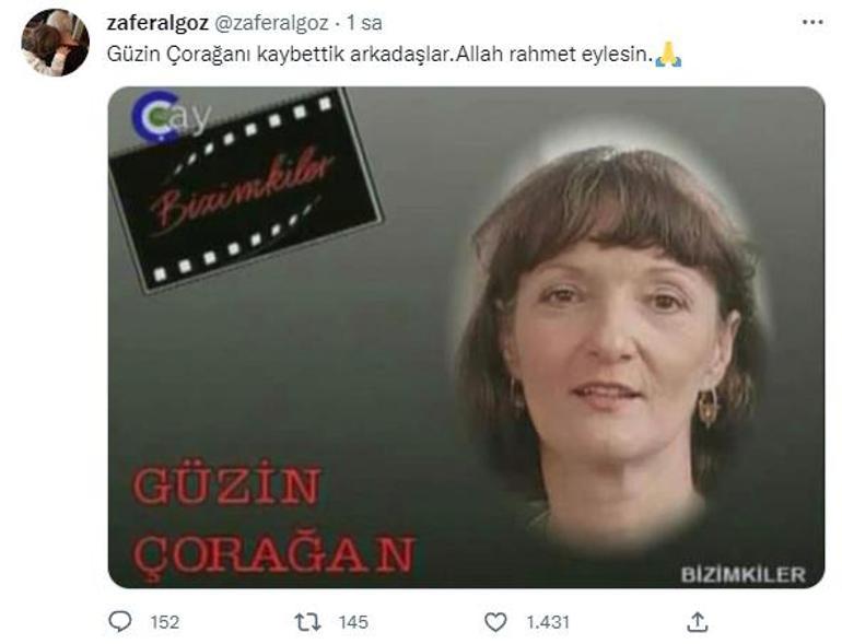 Acı haberi oyuncu Zafer Algöz sosyal medya hesabından duyurdu. Algöz yaptığı açıklamada, "Güzin Çorağan'ı kaybettik arkadaşlar.Allah rahmet eylesin" ifadelerini kullandı.