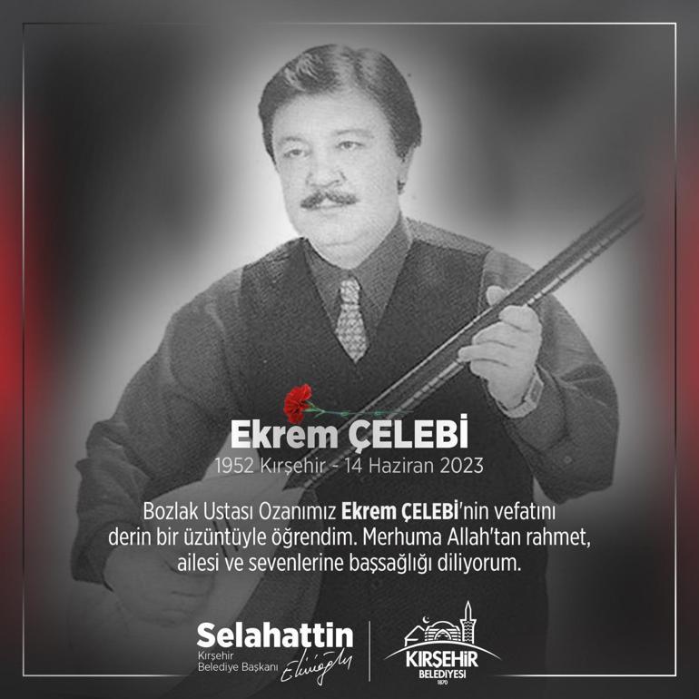İç Anadolu ve Bozlak müziğinin temsilcisi olarak tanınan saz sanatçısı Ekrem Çelebi, 71 yaşında hayatını kaybetti. Kırşehir Belediye Başkanı Selahattin Ekicioğlu, acı haberi sosyal medya hesabından duyurdu.