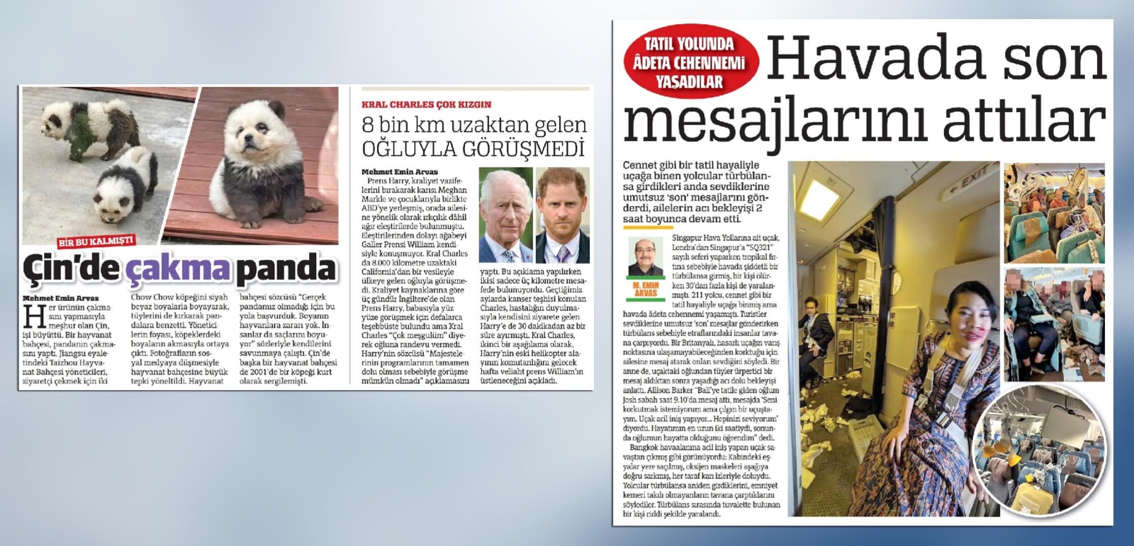 Türkiye’nin 9 Mayıs tarihli sayısının arka sayfasındaki “Çin’de çakma panda” haberi ile hemen yanındaki “Kral Charles çok kızgın” haberinde Mehmet Emin Arvas imzası yer alıyordu. Arvas, aynı gün dünyanın farklı noktalarındaki iki ülkeye gidemeyeceğine (!) göre oraya gitmeden bilgi almış. Fakat haberlerde hiçbir kaynak yok, mahreç yok.