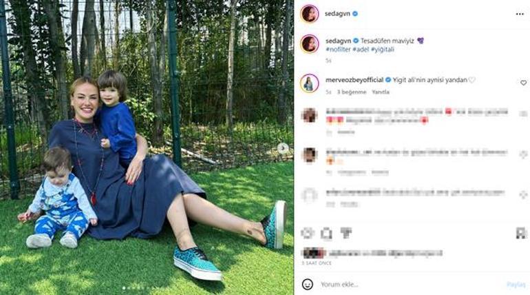 Ünlü oyuncu, çocukları Adel ve Ali ile yeni karelerini 294 bin takipçisinin bulunduğu Instagram sayfasından takipçileriyle paylaştı. Güven'in, ''Tesadüfen maviyiz'' notunu düştüğü karelerine takipçilerinden beğeni ve yorum yağdı.Merve Özbey, ünlü oyuncunun paylaşımına, ''Yiğit Ali'nin aynısı yandan'' yorumunda bulundu.