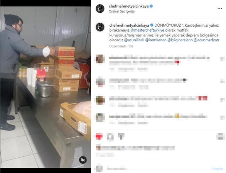 Ünlü isim, 1.4 milyon takipçili hesabından, "Dönmüyoruz! Kardeşlerimizi yalnız bırakamayız. 'MasterChef Türkiye' olarak mutfak kuruyoruz. Yarışmacılarımız ile yemek yaparak deprem bölgesinde olacağız" mesajını yazdığı bir video yayınladı.