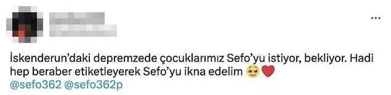 Bir Twitter kullanıcısı, "İskenderun'daki depremzede çocuklarımız Sefo'yu istiyor, bekliyor. Hadi hep beraber etiketleyerek Sefo'yu ikna edelim" diyerek, sosyal medyadan yardım istedi.