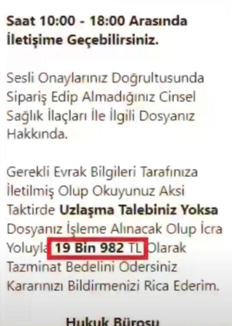 Taşdöğen, söz konusu tebligatta yer alan ifadelerin “Sipariş edip almadığınız cinsel sağlık ilaçları ile ilgili dosyanız hakkında dosyanız işleme alınacak olup icra yoluyla 19 bin 982 TL olarak tazminat bedelini ödersiniz” olduğunu anlattı.