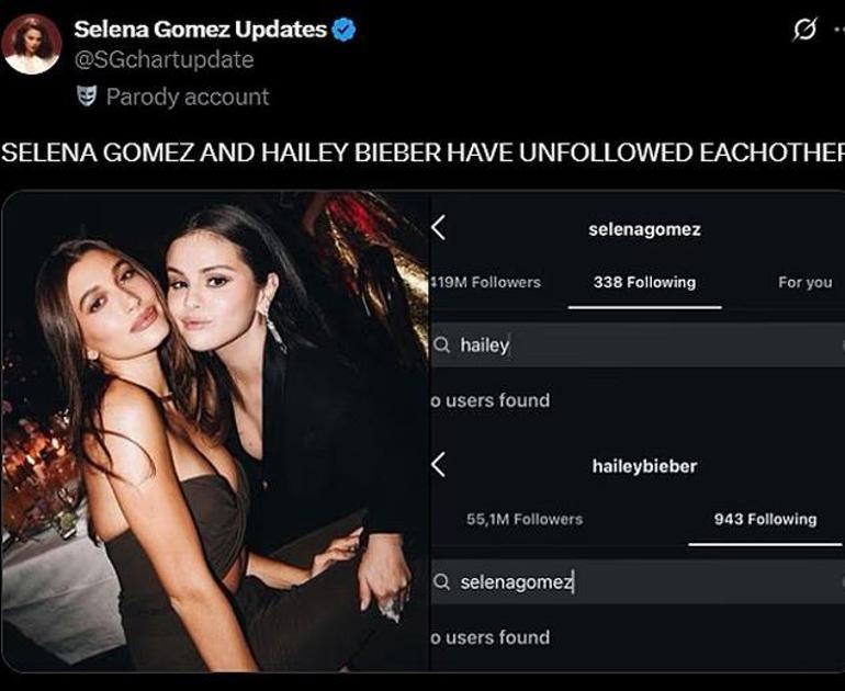 İki güzel isim, sosyal medyadan birbirini takibi bıraktı. Gomez ve Hailey 2023 yılında birbirlerini takip etmeye başlamıştı. Daha sonra son birkaç yıldır birbirlerinin paylaşımlarını beğenerek sessizce birbirlerine desteklerini göstermişlerdi. Geçtiğimiz Aralık ayında Hailey, Selena'nın Benny Blanco ile nişanını kutladığı Instagram paylaşımını beğenmişti.