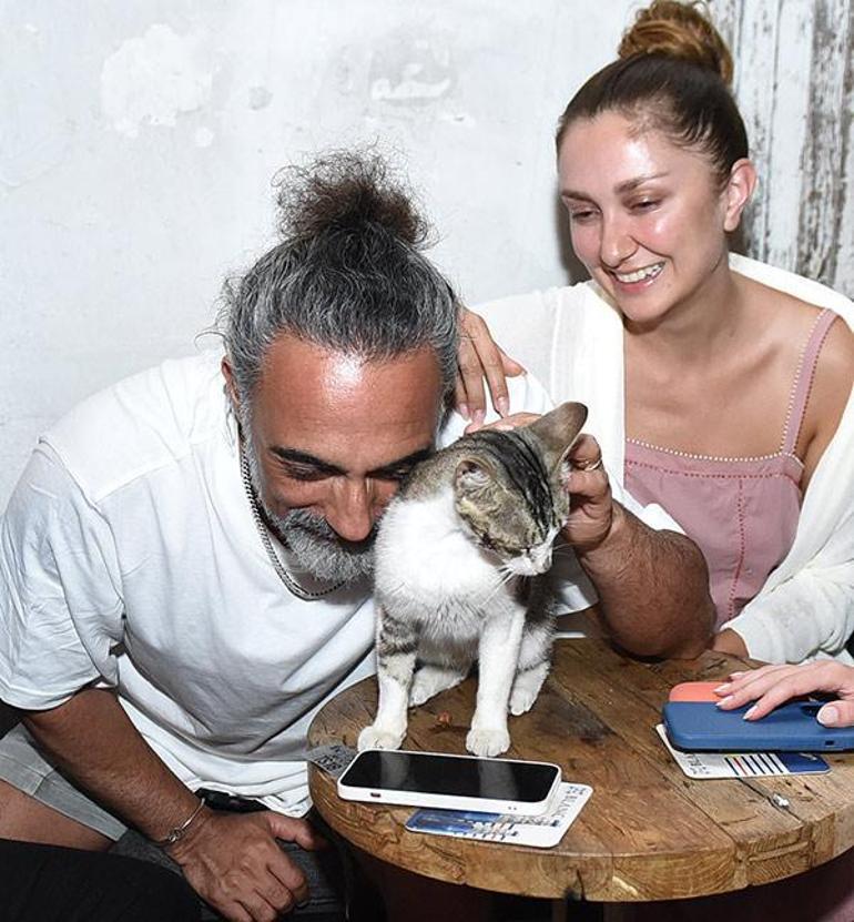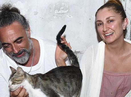 20 yıldır mutlu bir evlilik sürdürdüğü Emel Karaköse ile birlikte tatil yapan ünlü oyuncu, masasına gelen davetsiz misafir yavru kedi ile poz verdi.