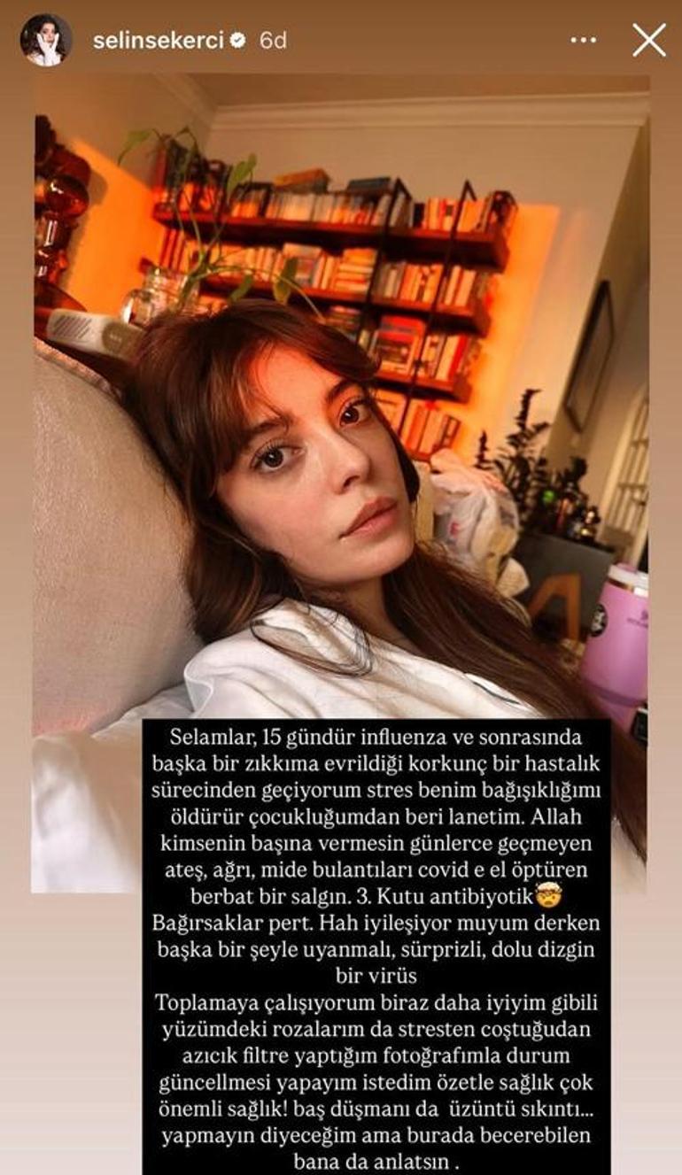 15 gündür influenza ile mücadele eden daha sonra strese bağlı rozalarının çıktığını belirten Selin Şekerci, fotoğraf paylaştı. Sağlığın önemine dikkat çeken Şekerci, "Bağırsaklar pert, iyileşiyor muyum derken başka bir şeyle uyanmalı, sürprizli, doludizgin bir virüs." dedi.