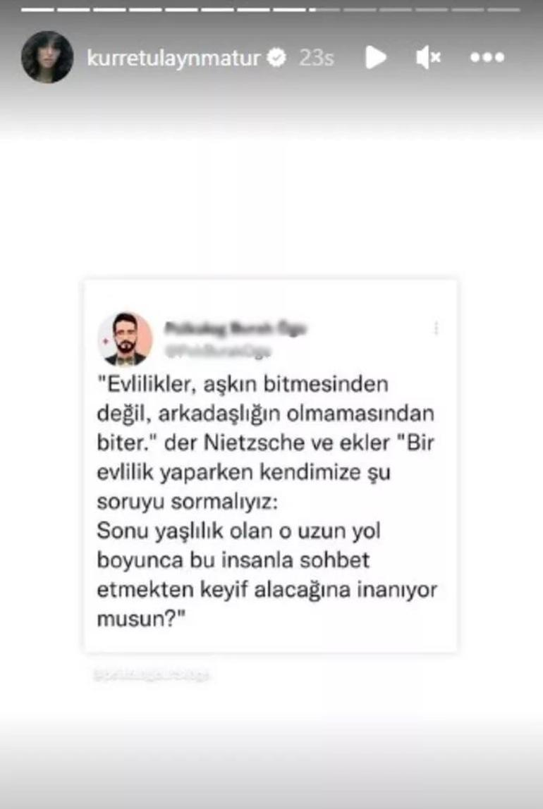 Matur, bu dedikodulardan sonra Instagram hesabından yaptığı paylaşımda Nietzche'nin ''Evlilikler aşkın olmamasından değil, arkadaşlığın olmamasından biter. Bir evlilik yaparken kendimize şu soruyu sormalıyız: Sonu yaşlılık olan o uzun yol boyunca bu insanla sohbet etmekten keyif alacağına inanıyor musun?'' notunu paylaşmıştı.