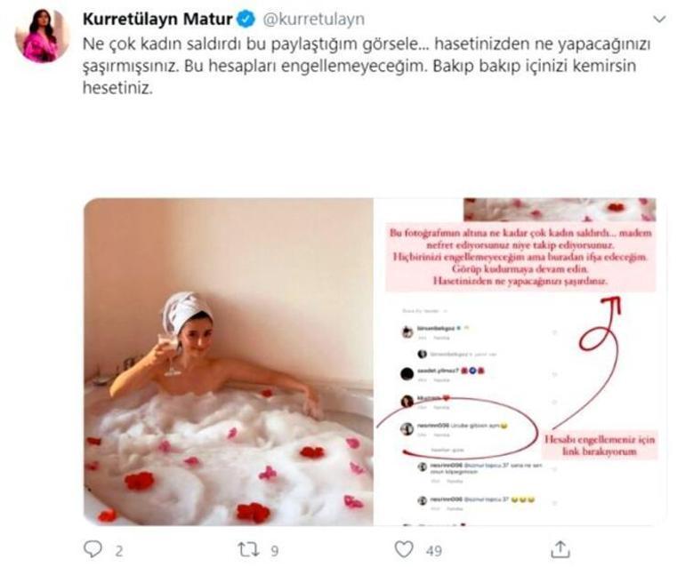 Fotoğrafına ‘ucube gibisin aynı’ yorumunu yapan takipçisini sosyal medya hesabından ifşa eden Kurretülayn Matur sert sözler sarf etmişti. Matur yaptığı paylaşımına, “Ne çok kadın saldırdı bu paylaştığım görsele. Hasetinizden ne yapacağınızı şaşırmışsınız. Bu hesapları engellemeyeceğim. Bakıp bakıp içinizi kemirsin hasetiniz” notunu düşmüştü.