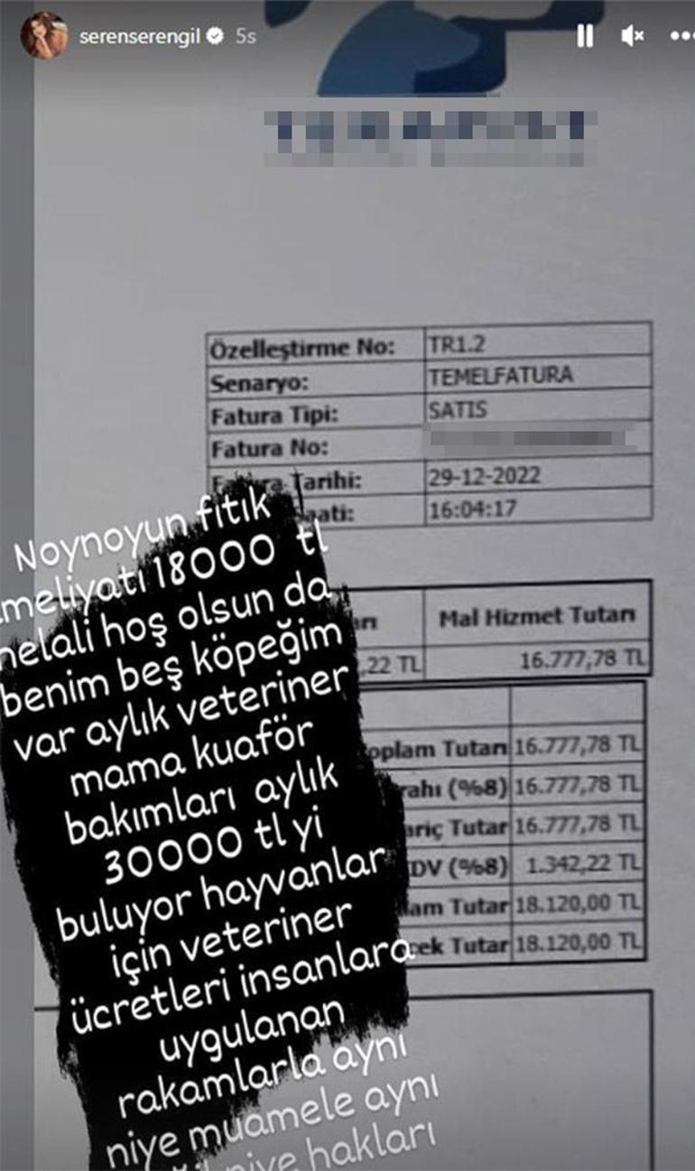 Instagram hesabından köpeğinin tedavi masraflarını gösteren makbuzu yayınlayan Seren Serengil, "Noynoy'un fıtık ameliyatı 18 bin TL. Helali hoş olsun da benim beş köpeğim var; aylık veteriner, mama, kuaför bakımları 30 bin TL'yi buluyor" mesajını yazdı.