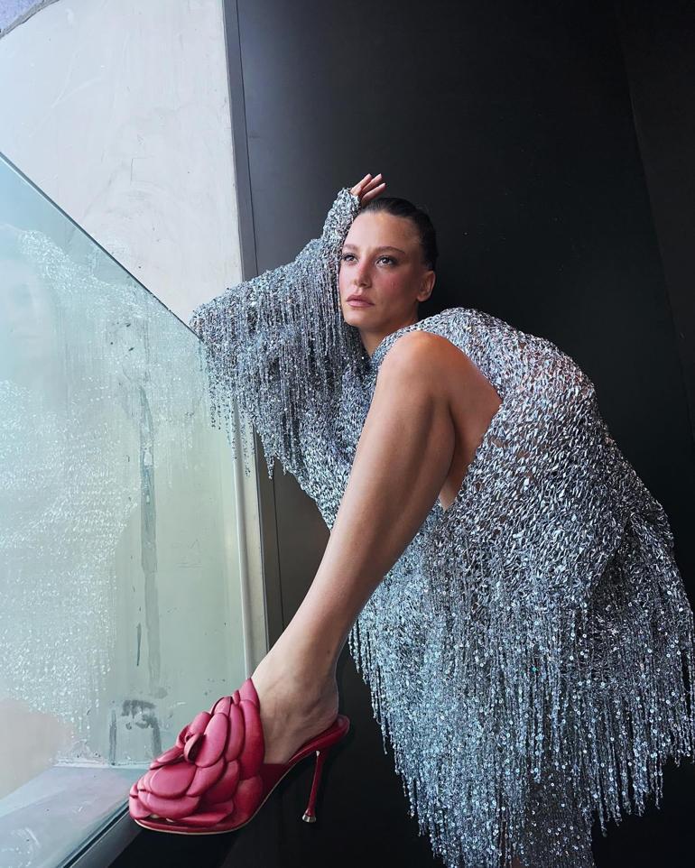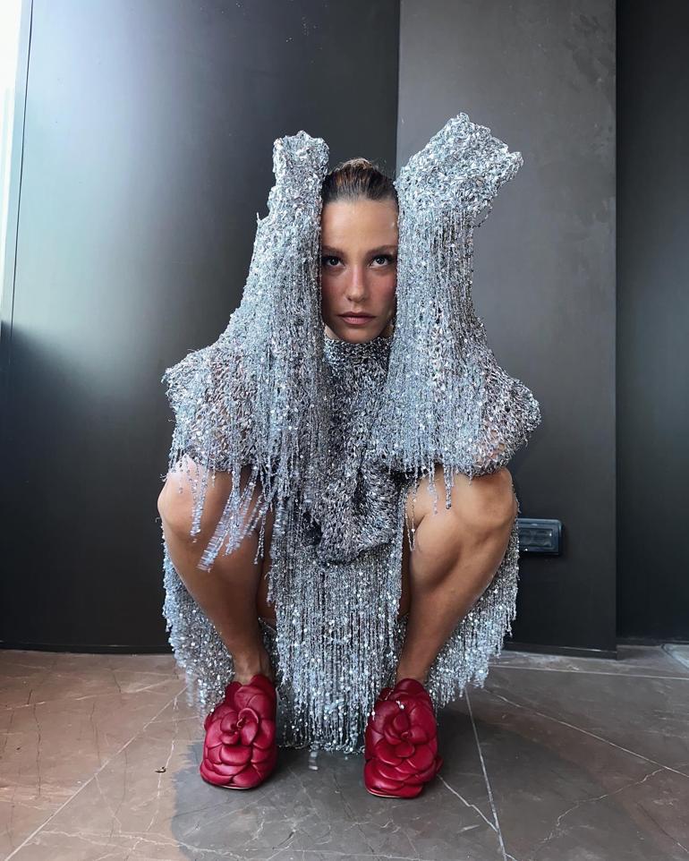 Sarıkaya, sosyal medya hesabından paylaştığı pozlarda gümüş dökümlü elbisesi ve kırmızı topuklularıyla resmen dillere düştü!