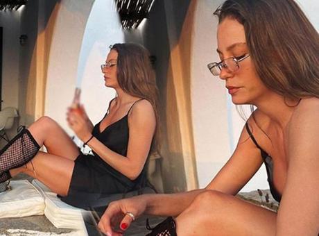 Tatiline devam eden ünlü oyuncu, bu kez siyahlar içinde objektif karşısına geçti. Uzun delikli çizmelerini, mini siyah bir elbiseyle kombinleyen Sarıkaya, gün batımında poz verdi.