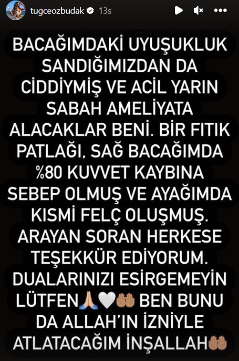 Son olarak ameliyattan çıktığını ve operasyonun iyi geçtiğini 674 bin takipçisi bulunan Instagram sayfasından duyuran Özbudak, "Ameliyatım güzel geçmiş çok şükür. Stay strong (güçlü ol) Tuçi" mesajıyla hastane yatağından fotoğraf paylaştı.
