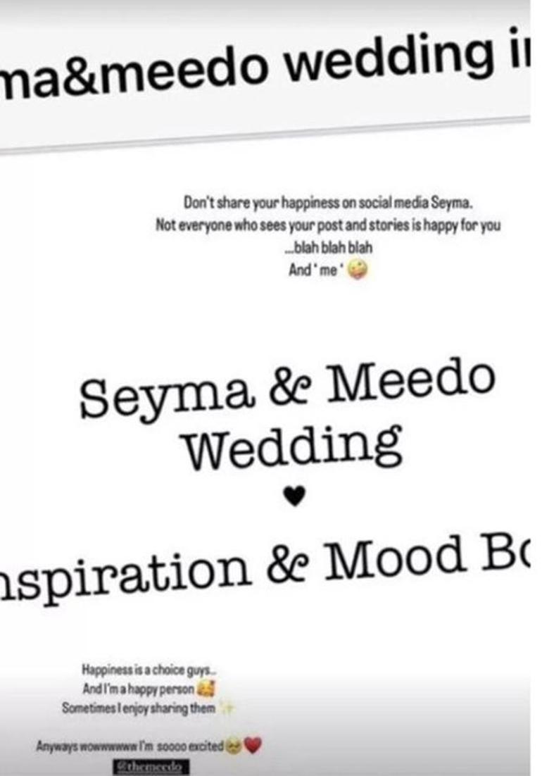 Sosyal medya fenomeni Şeyma Subaşı, son olarak Mısırlı iş insanı sevgilisi Meedo ile evlilik davetiyesini sosyal medyadan paylaştı. "Mutluluğunu artık sosyal medya hesabından paylaşma Şeyma" diye kendini uyaran sosyal medya fenomeni "Mutluluk bir seçimdir ve ben bu şekilde çok mutluyum. Bazen de onları paylaşırım. Her neyse ben çok heyecanlıyım" diyerek evleneceğini duyurdu.