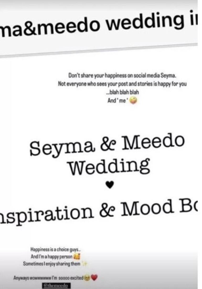 Sosyal medya fenomeni Şeyma Subaşı, geçtiğimiz günlerde Meedo ile evlilik davetiyesini sosyal medyadan paylaştı. "Mutluluğunu artık sosyal medya hesabından paylaşma Şeyma" diye kendini uyaran sosyal medya fenomeni "Mutluluk bir seçimdir ve ben bu şekilde çok mutluyum. Bazen de onları paylaşırım. Her neyse ben çok heyecanlıyım" diyerek evleneceğini duyurdu.