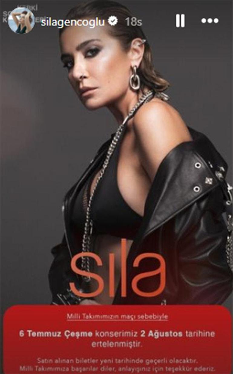 Instagram hesabından konserini ertelendiğini duyuran Sıla, "Milli takımımızın maçı sebebiyle 6 Temmuz Çeşme konserimiz 2 Ağustos tarihine ertelenmiştir. Satın alınan biletler yeni tarihinde geçerli olacaktır. Milli takımımıza başarılar diler anlayışınız için teşekkür ederiz" ifadelerini kullandı.