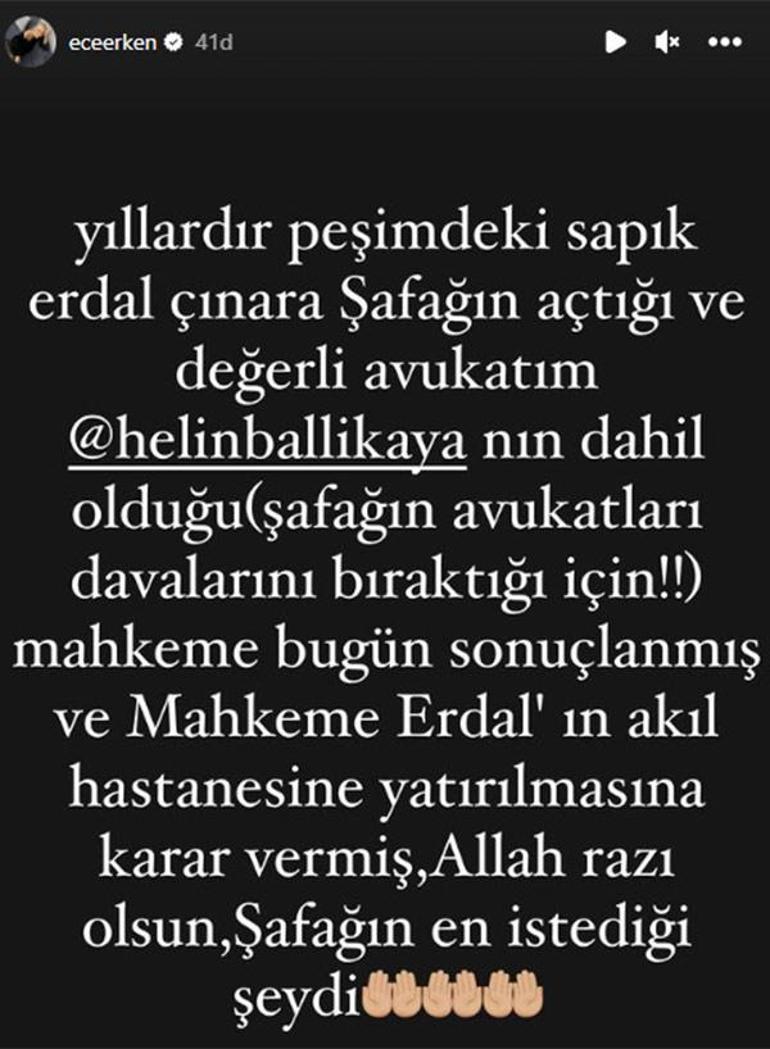 Ece Erken, mahkemenin kararını sosyal medya hesabından duyurdu. Ünlü sunucu, Erdal Çınar'ın akıl hastanesine yatırılacağını açıkladı.