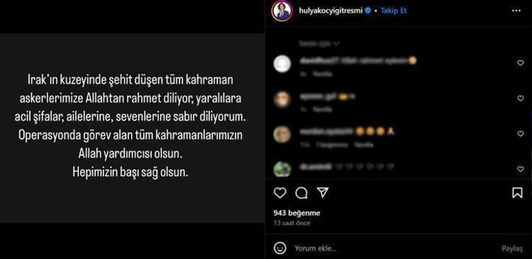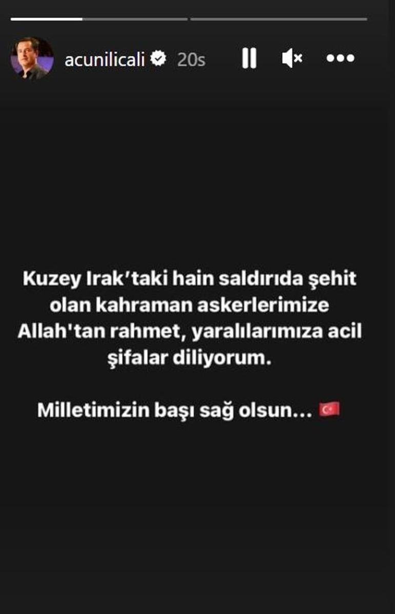 "Irak'ın kuzeyinde şehit düşen tüm kahraman askerlerimize Allah'tan rahmet diliyor, yaralılara acil şifalar, ailelerine, sevenlerine sabır diliyorum. Operasyonda görev alan tüm kahramanlarınızın Allah, yardımcısı olsun."