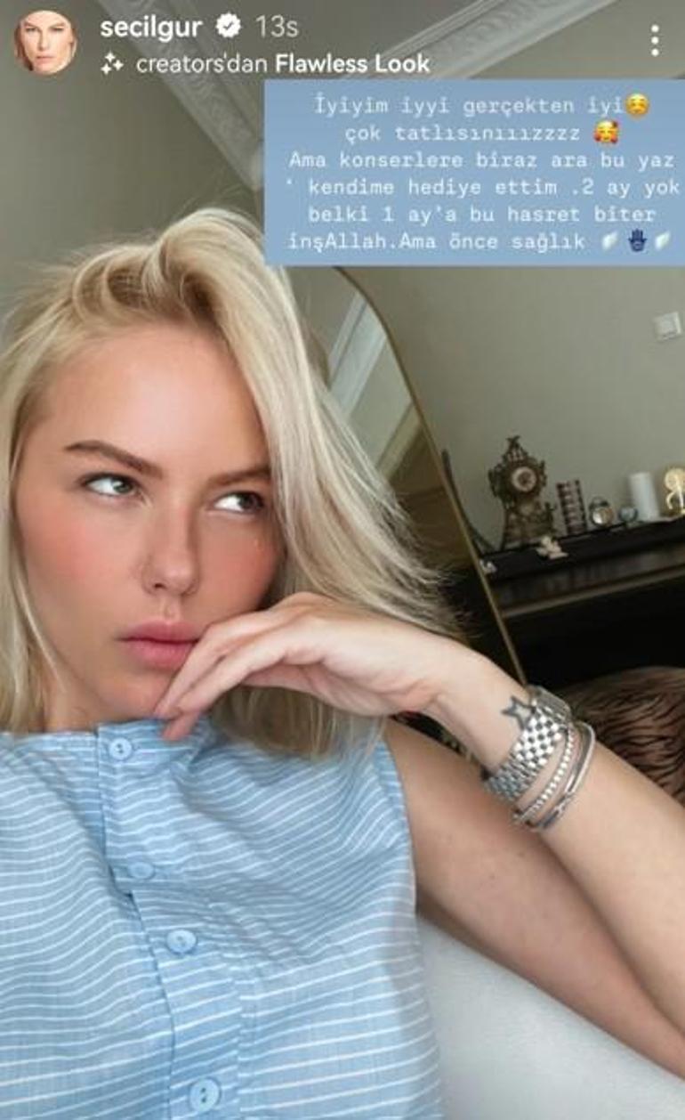 Son sağlık durumunu da açıklayan şarkıcı; ''İyiyim iyi gerçekten iyi. Çok tatlısınız. Ama konserlere biraz ara. Bu yaz kendime hediye ettim. 2 ay yok. Belki 1 aya bu hasret biter inşallah. Ama önce sağlık'' ifadelerini kullandı.