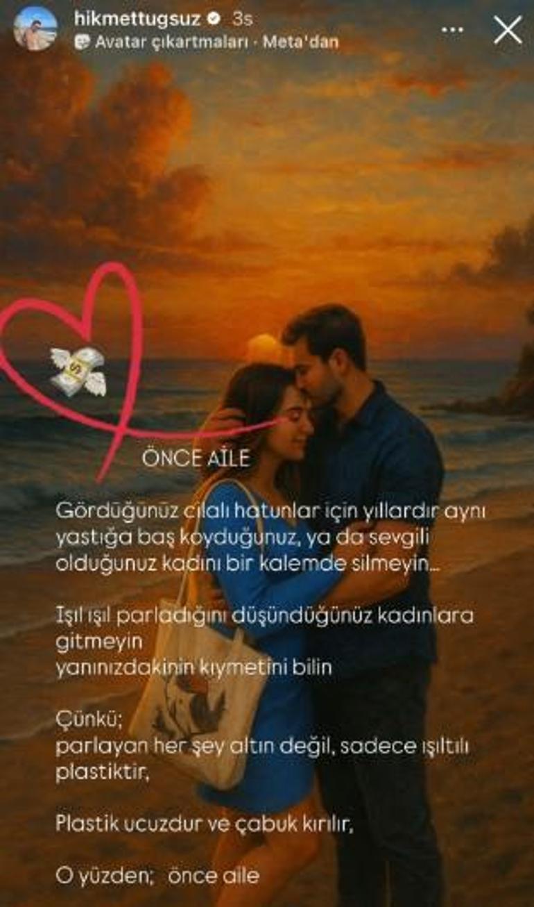 ''Önce aile. Gördüğünüz cilalı hatunlar için yıllardır aynı yastığa baş koyduğunuz, ya da sevgili olduğunuz kadını bir kalemde silmeyin... Işıl ışıl parladığını düşündüğünüz kadınlara gitmeyin, yanınızdakinin kıymetini bilin. Çünkü; parlayan her şey altın değil, ışıltılı plastiktir. Plastik ucuzdur ve çabuk kırılır. O yüzden; önce aile''