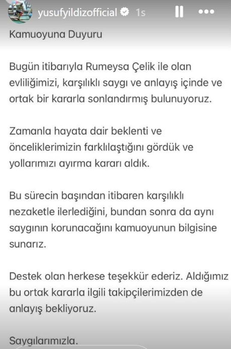 Yıldız, Instagram hesabından yaptığı yeni paylaşımda eşi Rumeysa Çelik ile boşandıklarını açıkladı.
