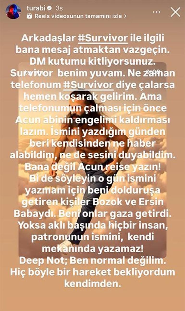 ''Arkadaşlar Survivor ile ilgili bana mesaj atmaktan vazgeçin. DM kutumu kitliyorsunuz. Survivor benim yuvam. Ne zaman telefonum Survivor diye çalarsa hemen koşarak gelirim. Ama telefonumun çalması için önce Acun abinin engelimi kaldırması lazım. İsmini yazdığım günden beri kendisinden ne haber alabildim, ne de sesini duyabildim. Bana değil Acun reise yazın! Bir de söyleyin o gün ismini yazmam için beni dolduruşa getiren kişiler Bozok ve Ersin babaydı. Beni onlar gaza getirdi. Yoksa aklı başında hiçbir insan, patronunun ismini, kendi mekanında yazamaz! Not: Ben normal değilim. Hiç böyle bir hareket bekliyordum kendimden''