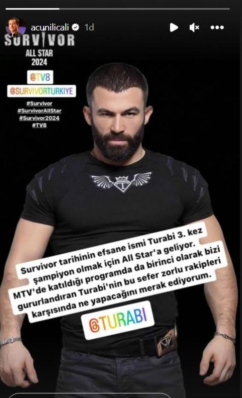 Yarışmanın başlamasına az bir zaman kala Acun Ilıcalı, yarışmacıları duyuruyor. Ilıcalı son olarak sosyal medya hesabından, Survivor’da 2 kez şampiyonluk elde eden Turabi’nin yeniden yarışacağını açıkladı.