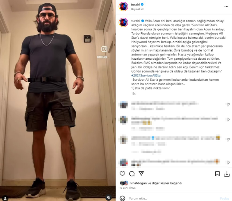 Instagram hesabından rakiplerine meydan okuyan Turabi, "Valla Acun abi beni aradığın zaman, sağlığımdan dolayı aldığım ilaçların etkisinden de olsa gerek Survivor All Star'ı, finalden sonra da gençliğimden beri hayalim olan Acun Firarda'yı, Turbo Firarda olarak sunmamı istediğini sanmıştım. Meğerse All Star'a davet etmişsin beni. Valla kusura bakma abi, benim buradaki Hollywood hayatımı bırakıp, oradaki açlığa geleceğimi sanıyorsan… Kesinlikle haklısın."