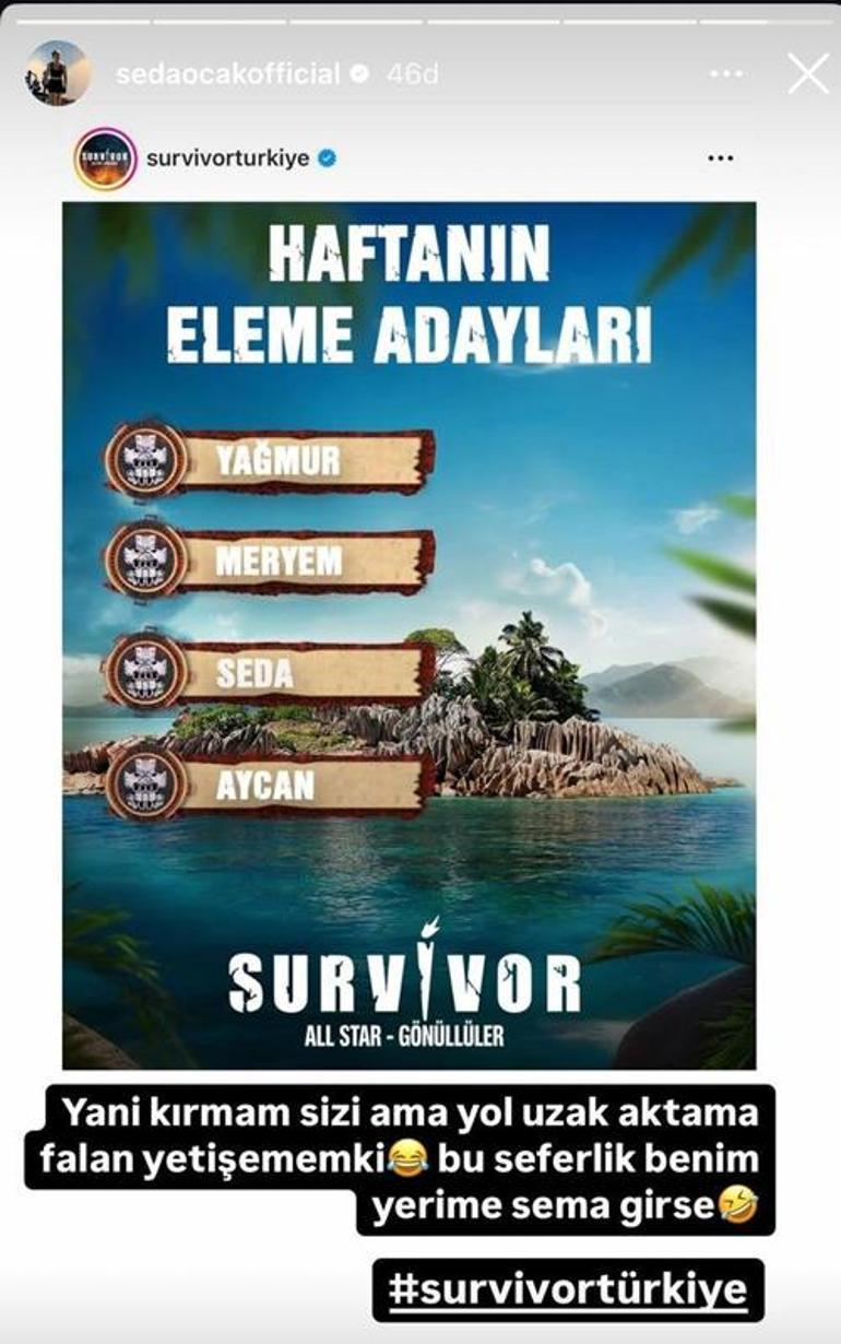 Seda Ocak da Instagram hesabından bu paylaşımı alıntılayarak, "Yani kırmam sizi ama yol uzak aktarma falan yetişemem ki... Bu seferlik benim yerime Sema girse" yazıp eğlenceli paylaşımda bulundu.