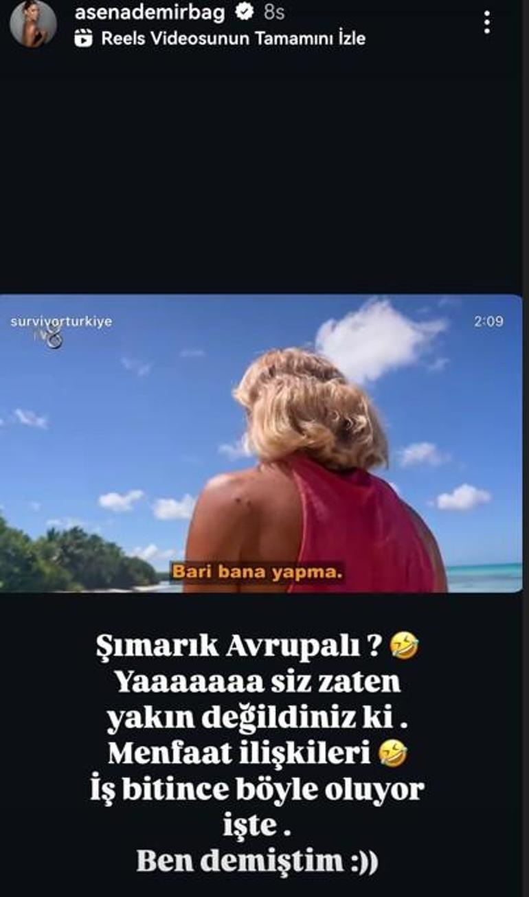 Survivor'ın yeni bölüm fragmanından Meryem Kasap'ın olduğu bölümü alıntılayan Asena, ''Şımarık Avrupalı? Ya siz zaten yakın değildiniz ki. Menfaat ilişkileri iş bitince böyle oluyor işte. Ben demiştim'' ifadelerini kullandı.