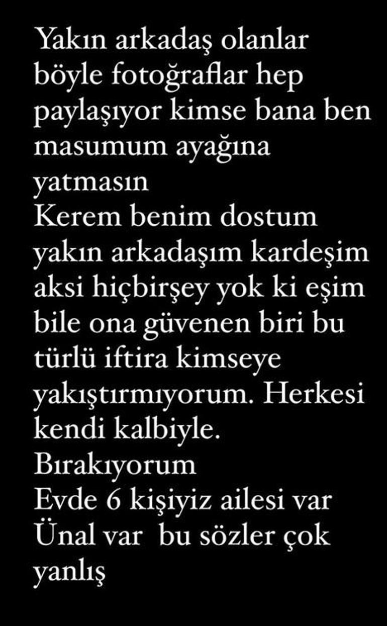 ''Yakın arkadaş olanlar böyle fotoğraflar hep paylaşıyor. Kimse bana ben masumum ayağına yatmasın. Kerem benim dostum, yakın arkadaşım, kardeşim. Aksi hiçbir şey yok ki eşim bile ona güvenen biri. Bu türlü iftira kimseye yakıştırmıyorum. Herkesi kendi kalbiyle bırakıyorum. Evde 6 kişiyiz, ailesi var, Ünal var. Bu sözler çok yanlış''
