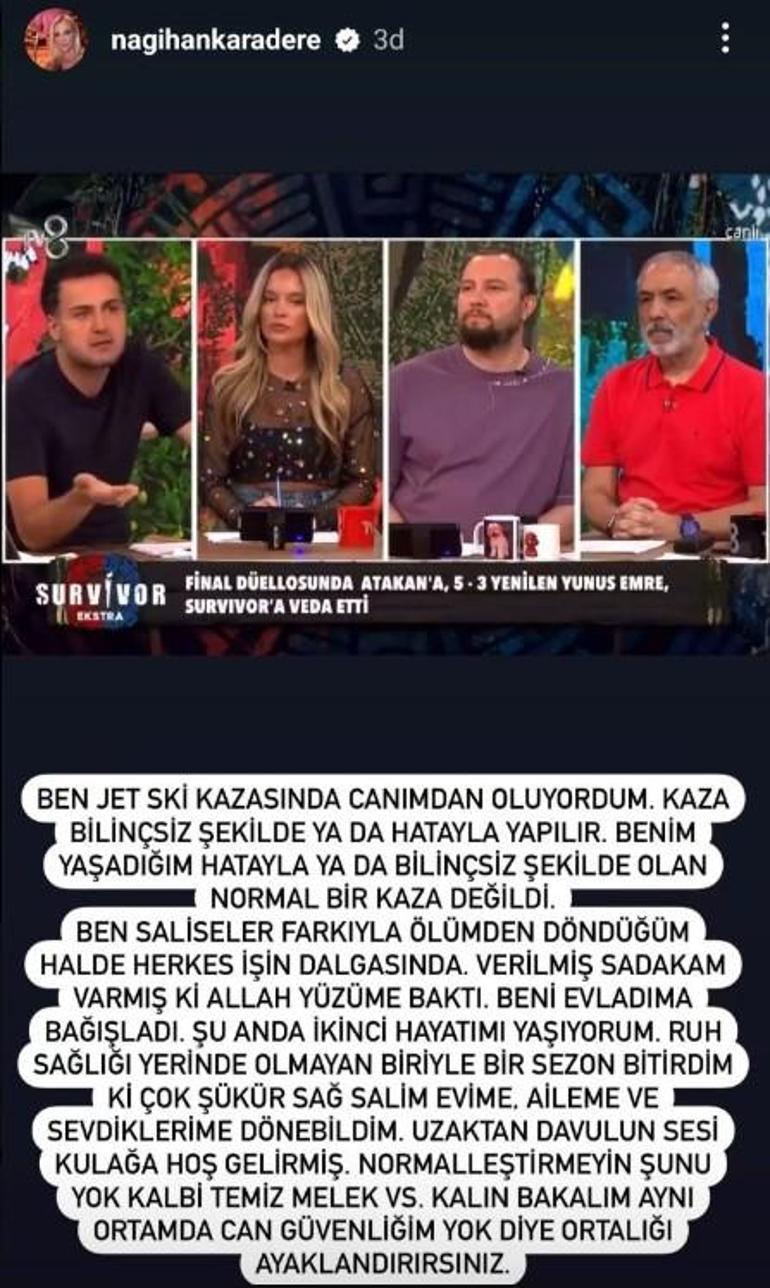 Yaşadığı Jet Ski talihsizliğine "Normal bir kaza değildi" diyen Nagihan Yunus Emre'nin kendisine "İşim yarım kaldı" dediğini de iddia etti.