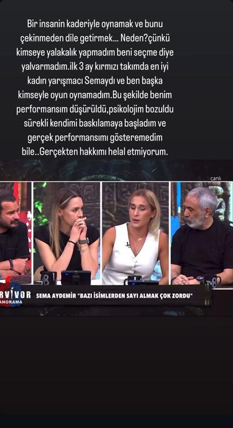 Sema'nın açıklamalarını paylaşan Tuğba şu ifadelere yer verdi: Bir insanın kaderiyle oynamak ve bunu çekinmeden dile getirmek... Neden? Çünkü kimseye yalakalık yapmadım beni seçme diye yalvarmadım. İlk 3 ay kırmızı takımda en iyi kadın yarışmacı Sema'ydı ve ben başka kimseyle oyun oynamadım. Bu şekilde benim performansım düşürüldü, psikolojim bozuldu.